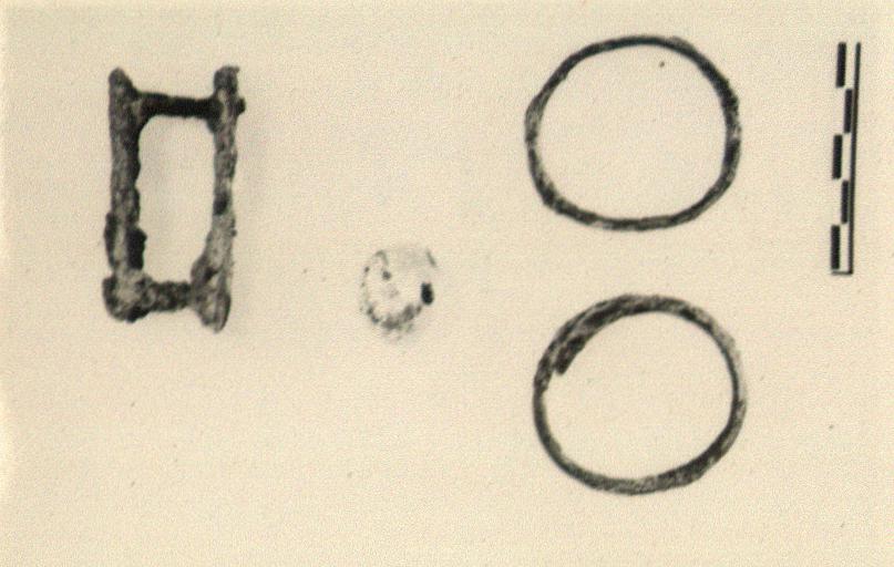 | Description: | Each is somewhat oval in shape and each is made of a single piece of heavy bronze wire so bent that the two ends overlap at the joint. One (a) is of slightly thicker wire than the other. | |