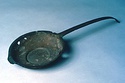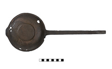 | Description: | Several small holes in bowl as a result of corrosion; otherwise intact. An open bowl with a long flat handle which is horizontal as it leaves the body, but turns downward towards its end. The rim of the bowl is flat on top and turned outward. Opposite the handle, there is a broad shallow spout which projects slightly. There is a slight sinking at the center of the bowl which gives it a small flat slightly off-set bottom. | |