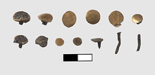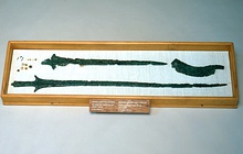 | Description: | Small irregular chunk of bronze with gold-leaf disk attached to it. (Probably one of the rivets from the sword, B 778, with rivet-head covering in place; the rivet heavily corroded ?) | |