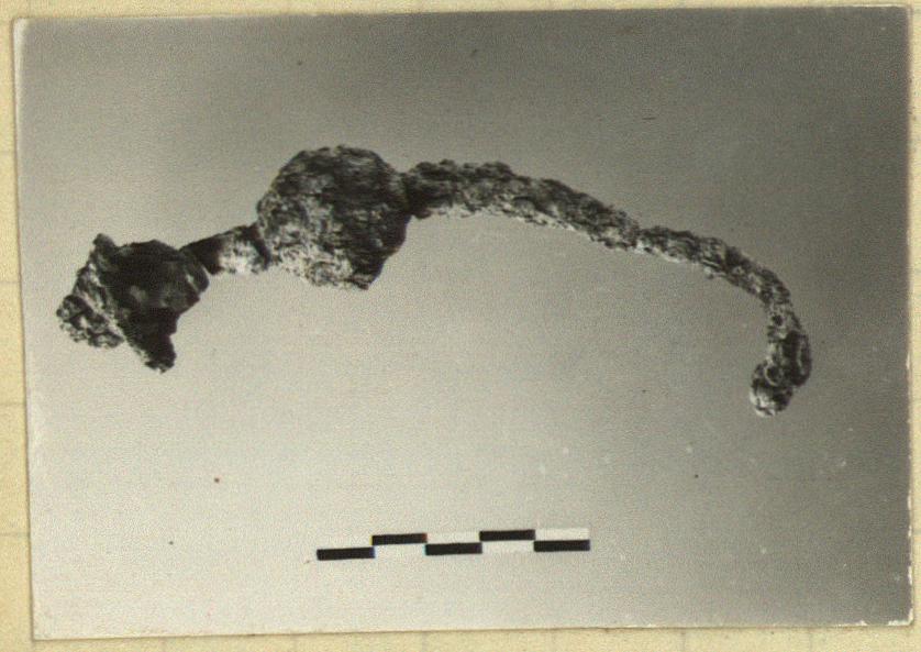 | Description: | Fragments of a pin with disk head and ball on shaft. Less of the shaft preserved (three fragments) than for B 740. The ball somewhat less corroded. Cf. B 840 (OO 619) | |