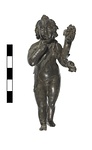 | Description: | Base missing; figure mounted on modern wood base. Standing figure, nude save for a goat skin which passes over his left shoulder. Held in his left hand and resting along his left arm is a cornucopia which springs from a leafy calyx-like sheath and is topped with a large grape-cluster. His right arm is bent, with the clasped fingers of the right hand held close to his chin. His hair is dressed with a heavy broid along the crown, ringlets falling at the sides and the back and a single small curling lock at the center of the forehead. Around the right arm near the shoulder, a thin groove, partly cover by a narrow flat band; ornament or join ? Surface unusually good. | |