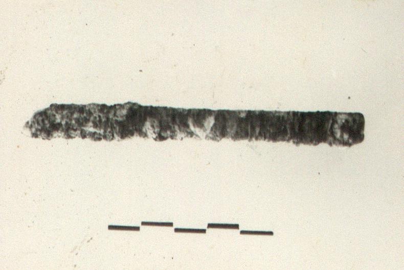 Massive rod shaped in form of bead and reel; slightly flattened on one side.