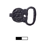 | Description: | Lyre-shaped solid piece with oval loop at one end and small projection at other. Hole near end of solid piece. Two pierced projections on back for fastening to belt. Traces of relief design on front. | |