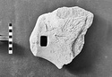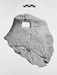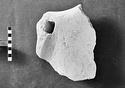 | Description: | The thin edge broken. A large shoulder blade, probably of a whale, with a rectangular cutting at the top. The broad surface shows marks of cutting. | |
