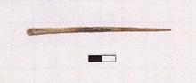 | Description: | Intact but for a small chip at spoon. Shaft, circular in section, flares to a narrow grooved spoon. Opposite end tapers to a very thin point. Well polished bone. Greenish tint with dark discoloration at center. | |