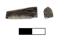 Length of bone, roughly square in section, slightly flaring at preserved end with palmette stamp carved into it. Stamp is slightly off the long vertical axis. Palmette with seven petals springing from two volutes.