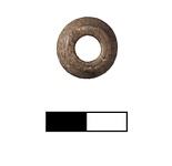 | Description: | Circular bone bead. Chipped at one rim. Covered in concretions. Large hole in the center. Biconical profile with flat collar at top and bottom. Yellow ivory color. | |