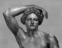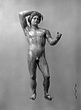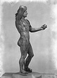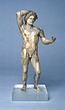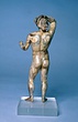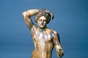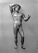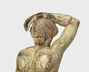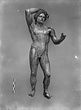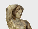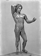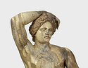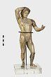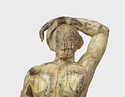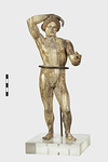| Description: | Statuette of Apollo Lykeios. The head found largely complete; the body mended from over two hundred fragments. Small fragments from the torso missing; the front part of the left foot, the little finger of the left hand, and the first two fingers of the right. Surfaces perfectly preserved. Nude standing figure, the weight on the right leg, the left leg forward with the knee slightly bent. Tongues in the soles of the feet for insertion into a base. The left arm is outstretched, the right arm raised with the forearm resting on the crown of the head, the palm of the hand down, the fingers relaxed. The long curly hair is elaborately dressed, with a braid from the center of the forehead, and a large knot, with projecting curls, at the back. The head is bent slightly to the figure 's left. Probably belonging with this figure, possibly the base for the column which may have stood beside it, is the small round base from the same well, BI 247. Inside pieces not used for reconstruction with BI objects in Study Collections-Case Νo. 4-Δ | |