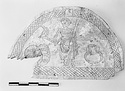 | Description: | End of vaulted box. A roughly semicircular plaque. Within a cross-hatched border a standing figure in Roman official costume. In his left hand he holds a staff or scepter, in ihs outstretched right a helmet. To the left are two large oval objects, shields, to her right a Panathenaic amphora. ADDENDA, (P.T.O.): The figure appears to be an up-dated version of Athena Lemnia. Cf. Emery (1938), I, p. 383, no. 881 and II, pl. 109. Aslo see Weitzmann (1972), Vol. III, p. 27, pl. XIII, no. 16. | |