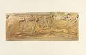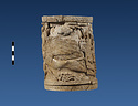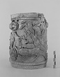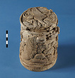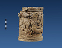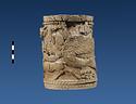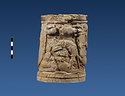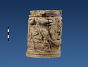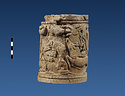 | Description: | Broken and split into many pieces, but largely complete; one side slightly higher than the other. A cylindrical box, tapering very slightly toward the top. The flat lid is held in place by a projecting central disk which fits down inside the wall. The bottom is made in two superimposed parts, one providing the actual floor of the box, the other, fastened to the first by ivory pegs, is a separate piece which provides a base for the whole. Traces of a metal lining, analyzed as tin, were found inside the box. The carved decoration, in fairly high relief, shows, on the lid, a griffin, crested, right, tearing two small deer. On the wall two similar griffins are represented at a larger scale, one right, the other left; they also are attacking deer both large and small. Considerably indications of a landscape backround. Close under the rim, two (?) horizontal lug-like handles, long, and slightly projecting, formed by the bodies of crouching animals; one of these fairly complete, the other fragmentary. Probably two pairs each formed by a lion and a deer. Pierced vertically. Border decoration at top and bottom, two zones of incised S-curved lines. | |