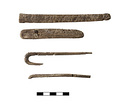 | Description: | The plain flat base of both brooches are preserved, that of a) the longer, rounded at one end and squared off at the other; that of b) rounded at both ends and with a shallow depression as if for a finger hold on the under-side, near the end at which the pin is attached. The pins, much mended and in both cases broken at both ends, consists each of a long piece, oval in section for most of the preserved length, but flattened toward the end at which they are attached to the bars; at the point of attachment, they curve around to form a sharp hook, projecting beyond the line of the bar. The outer edge of the pin on a), near the point of attachment, is serrated, and the serrations continue around the edge of the hook part. A similar serrated piece appears to belong to b). Nothing of any catch at the opposite end is preserved, nor is it clear how bar and pin were fastened together. c) is a plain rounded fragment of a pin perhaps from a similar brooch. | |
