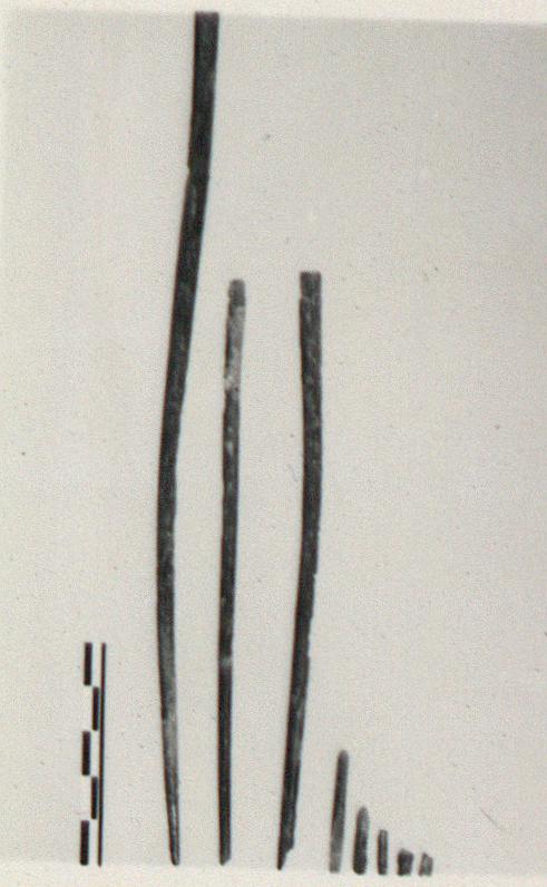 | Description: | The "set" consists of one complete pin, two good-sized fragments of others, and five scraps. The complete pin and the two large fragments are each mended from several pieces. Each consists of a plain tapering shaft, round in section, and somewhat curved or bent, and cut off straight at the thick end. | |