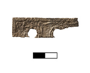 | Description: | An oblong plaque, dimensions full preserved, one corner missing. One side is rough, on the other traces of decoration in low relief. Along one long edge two holes rather less than a full circle, are cut through the plaque. "Probably the top of a comb, made with removable teeth" (S.A.I., 1964). | |