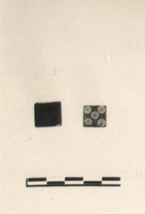 Description:   Spots consist of two incised concentric circles around central incised point. On the end of each die (ends as regards graining of bone) are the spots three and four; On the other four faces in sucession are one, two, six, five.