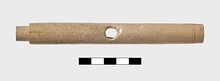 | Description: | Cylinder, flanged at one end to fit innermost piece. About two-thirds of the upper side split off; in the remainder two round stop-holes. On the other side another, about half way down the length of the piece. | |