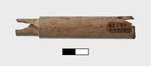 | Description: | One end broken; lengthwise cracks and chips. Preserved end has rabbet to take another section over it. One large hole. Bone stained brown. | |