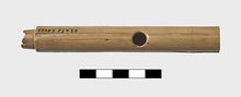 | Description: | Somewhat split lengthwise but complete except for chips. Section of flute with one end flanged for other section to fit against; three holes on one side, one on the other. Scratched lines around it, near holes, and a groove lengthwise down the side with the one hole. | |