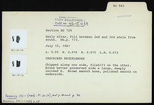 | Description: | Chipped along one side, filed (?) on the other. Along better preserved side a large, deeply incised E. Brown smooth bone, polished smooth on underside. | |