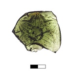 | Description: | Stamped fragment. Six petalled rosette, in concave bottom. Greenish glass. | |