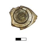 | Description: | Base of vessel with raised decoration on exterior of bottom. Broken all around. Bottom convex on interior; on exterior more or less flat with thin raised added spiral. | |