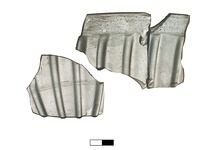 | Description: | Two fragments from rim and wall of a deep bowl. Very slightly flaring rim, thick vertical ridges on side. Thick greenish-blue glass. | |