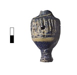 | Description: | Mended from several fragments; mouth and some of body missing. Vertical ribbing on body. Small, high foot. Surface decorated with yellow lines. Glass dark blue. | |