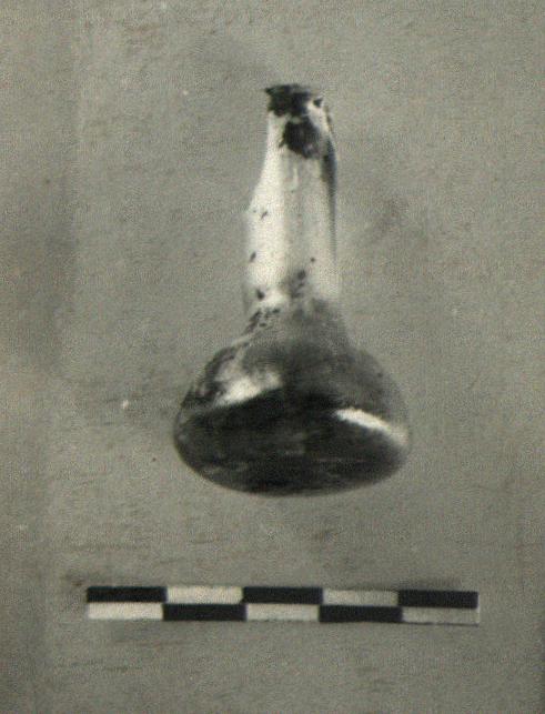 | Description: | Some of neck and mouth missing. Tall cylindrical neck; the glass doubled over to form a narrow projecting lip. Hemispherical body; flat bottom. Opaque greenish blue glass. | |