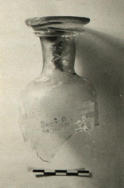 | Description: | Neck, lip and part of shoulder preserved. Band handle, from below lip to shoulder, missing. Round mouth with rounded flaring lip, set off by a ridge below. Narrow neck; short shoulder, rounding to nearly vertical side wall. The glass nearly colorless; heavily oxidized. | |