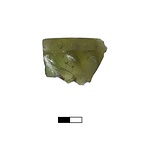 | Description: | Fragment from rim of moulded bowl. Plain lip, below which on the outside are short heavy diagonal ribs. Thick glass, olive green in color, and much oxydized. | |