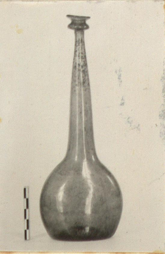 | Description: | Broken at the mouth but complete. Long-necked bottle with flattened body and moulded mouth. Bottom sharply concave. Light brown glass. | |