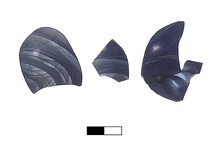 | Description: | Three non-joining fragments. Bottle has globular body. Base slightly concave. No pontil. Blue marbled with white threads mavered in. Pin-prick bubbles. North Italian ware (?) | |