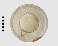 | Description: | Mended from several pieces; a small fragment of floor, and a little of rim. Straight-sided ring foot; flat floor, rising at edge to meet rim. Rim projecting; slightly concave on upper surface. Opaque white glass with faint grayish marbling. | |