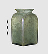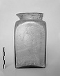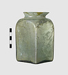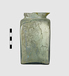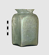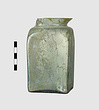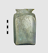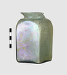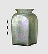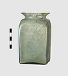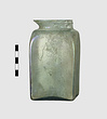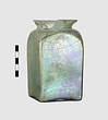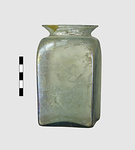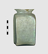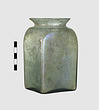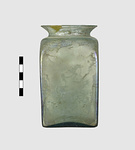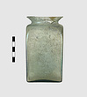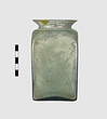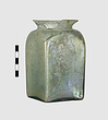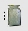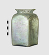 | Description: | Rim chipped, otherwise complete. Body square. Round mouth with flaring rim opens directly out of body. Light bluish green glass. | |