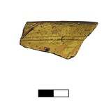 | Description: | Fragment preserving part of rim and beginning of wall. Molded bowl with one groove inside at base of rim. Brown glass with enamel weathering. | |