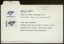 | Description: | Fragment from rim and start of wall. Molded bowl, ribbed. One groove inside. Dark brown glass with iridescence. | |