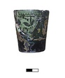 | Description: | Mended from three pieces. About one-third of rim and body missing. Heavy straight walled. Side has from top: wavy white line; straight white line; band of painted floral design in white, yellow, brown, blue; straight white line. Blue-green glass. | |