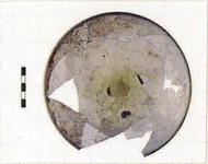 | Description: | Mended from many fragments. One segment of rim and bowl missing otherwise largely complete. Cloudy, dull patches on the interior surface. Shallow bowl, flattened base, lip slightly inturned. Mold-blown spiral ribbing radiates from center toward rim on the underside of the bowl. Cf. G 558 | |