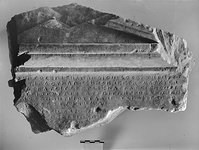 | Description: | Fragment of inscribed stele with pediment top. The right side of the gable preserved; the stone broken away below and on left. Eleven lines of the inscription preserved. Hymettian marble. ADDENDA Belongs with I 1966. | |