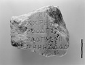 | Description: | Fragment of inscribed stele. The surface much weathered. Part of the rough picked left side preserved, but the surface of the inscribed face has been chipped away for about 0.05m. from the left edge. Five lines, of figures, preserved. Mica veins in the marble; pentelic marble. ADDENDA: Fragment from the building accounts of the Propylaea with I 2894. | |