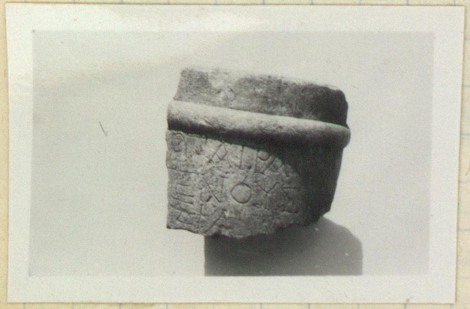 | Description: | Fragment from top of columnar grave monument. Part of top and about half of the circumference preserved. Three lines of the inscription preserved. Hymettian marble. | |