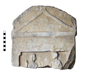On the top, the outline of a pediment in top relief. Below, the upper parts of the figures of a man and a a woman, facing. The back rough.