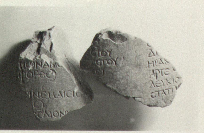 Dimensions:   H. a) 0.167, b) 0.145, c) 0.101; Lett. H. (of all fragments) ca. 0.01; W. a) 0.125, b) 0.174, c) 0.103; Th. a) 0.085, b) 0.088, c) 0.031