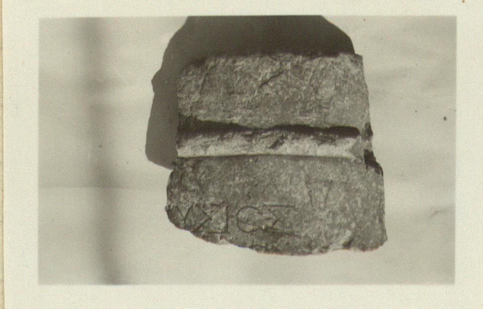 | Description: | Inscribed columnar grave monument. Fragment from the front, with part of the ring preserved. Six letters of the inscription preserved in one line, and the tops of two in the line below. Hymettian marble. | |