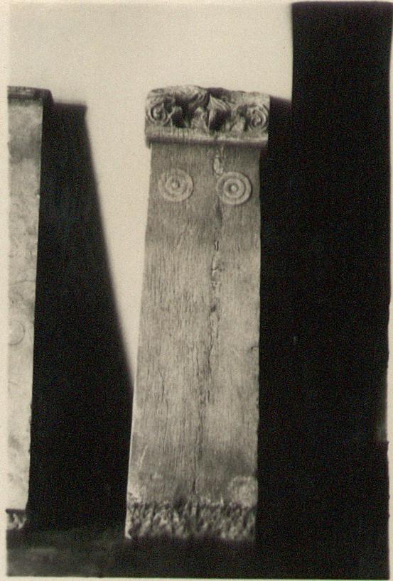 | Description: | Inscribed stele with ornamental top of palmette and volutes. Upper part of ornament mended from many fragments. Near the top, two double concentric discs with button in center (simplified rosettes). At the bottom a few centimeters of the front are chipped away for setting up. All letters worn away. Pentelic marble. | |