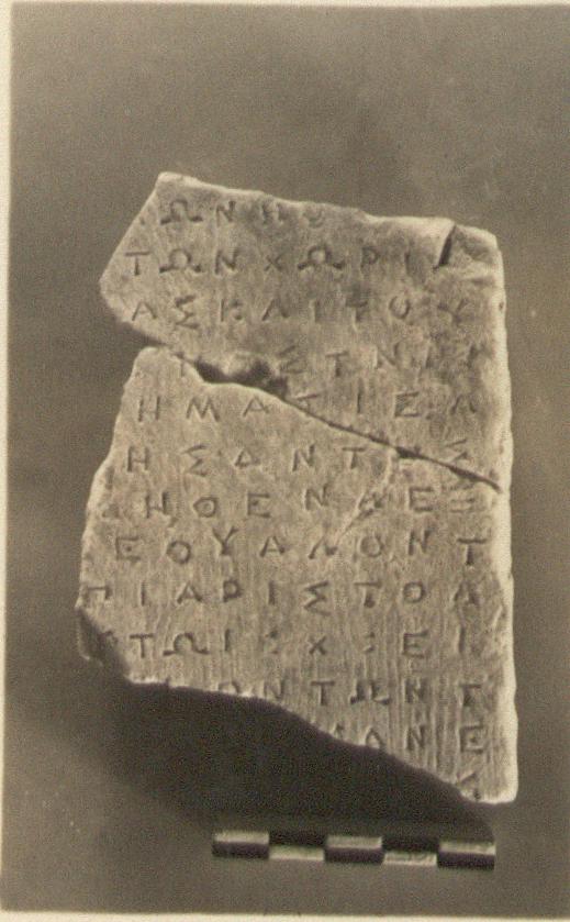 Fragment Β 494 (a), part of one side, the right side of face A, is preserved, tooth chisseled; otherwise broken.