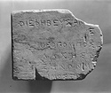 | Description: | Left side of inscribed base. Back, side and under surface rough picked. In the top, a rectangular socket preserved along left side. Socket rough picked, rest of top surface smooth. Left edge of inscribed surface beveled; edge of left side, beyond beveling, has a smooth band. Ephebic dedication. Inscribed, on front, in rather irregular letters. Hymettian marble. | |