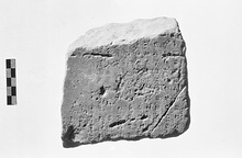 | Description: | Inscribed fragment. Rough picked back preserved; otherwise broken. A freshly broken fragment joins at the lower right. The surface worn. About twelve lines of the inscription preserved; stoichedon. Pentelic marble. | |