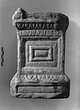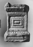 | Description: | Small rectangular base with moulded top and bottom, resembling altar. Bottom rough picked; top has smooth finished circular band surrounding rough picked sinkage; at the upper corners, small projections: two opposite, broken away. Sides plain: splay and taenia top and bottom; back similar with panel in central plain surface. Front: taenia paneled, splays replaced by crude ovolo. Central surface elaborately paneled, with inscription on upper border. Dedication. Pentelic marble. | |