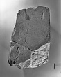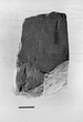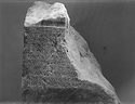 Broken top, bottom and back; the left side smooth picked. The lower part of the face is broken away at an obtuse angle to the small remaider of the inscribed surface.