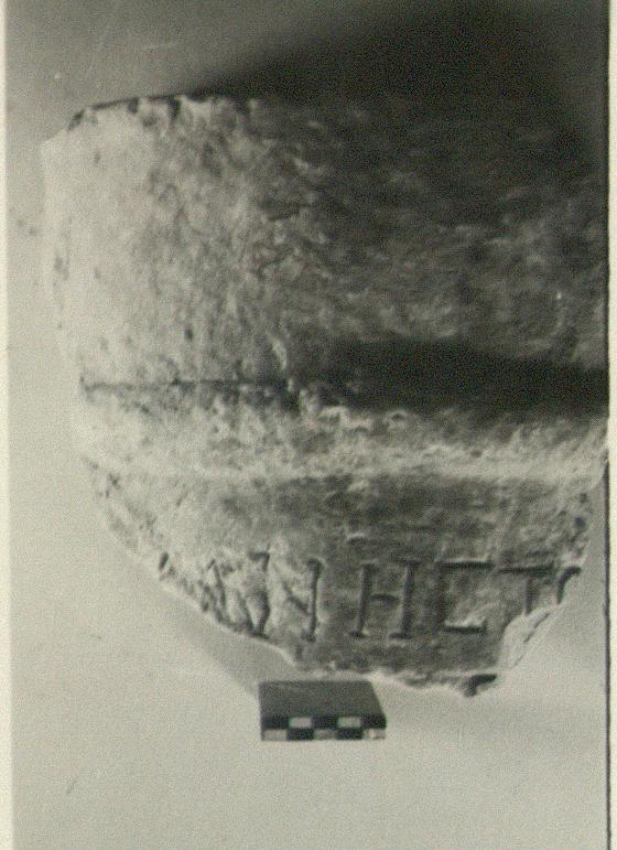 | Description: | Fragment of large columnar grave monument. Part of top and raised band near top preserved. Seven letters remain. Hymettian marble. | |